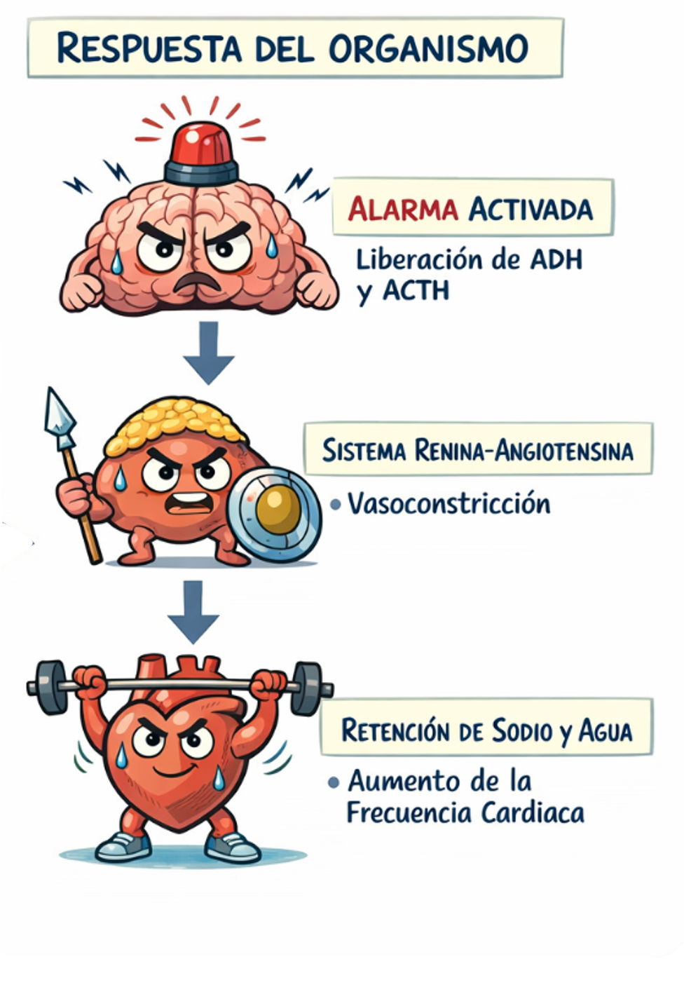 El eje renina-angiotensina-aldosterona (RAA) se activa a nivel del aparato yuxtaglomerular del riñón, ante la perdida de perfusión renal, descenso del sodio y activación simpática β1. Inicialmente, es compensador, ya que aumenta la presión arterial mediante vasoconstricción, retención de sodio y agua. Sin embargo, la activación mantenida incrementa la poscarga y la volemia, favoreciendo la congestión. Además, promueve remodelado cardíaco, fibrosis miocárdica y disfunción endotelial, contribuyendo de forma clave a la progresión de la insuficiencia cardíaca congestiva.