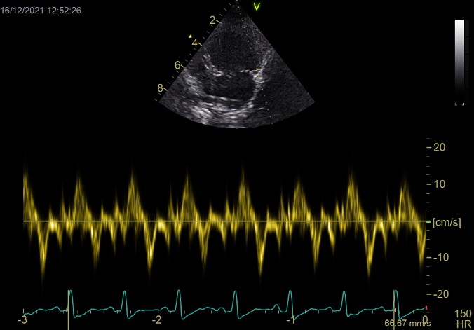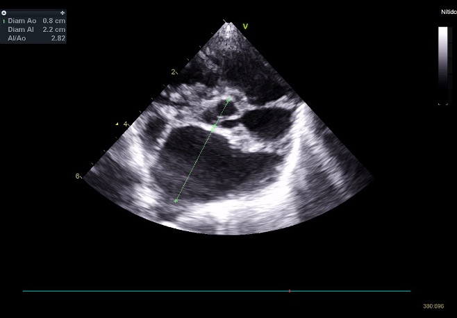 Existe una progresión de la patología hacia una disfunción diastólica restrictiva, con un aumento de la velocidad pico E hasta 1,76 m/s, lo que indica que el paciente es refractario al tratamiento. Posiblemente continúe con frecuencias respiratorias elevadas. Habría que reevaluar si existe resistencia a los diuréticos y trabajar en reducir la poscarga (presión arterial). Además, según la edad del paciente, podría ser candidato a cirugía mitral edge-to-edge (si cumple criterios anatómicos y funcionales) y, en caso de no ser idóneo, podría considerarse la septostomía auricular.