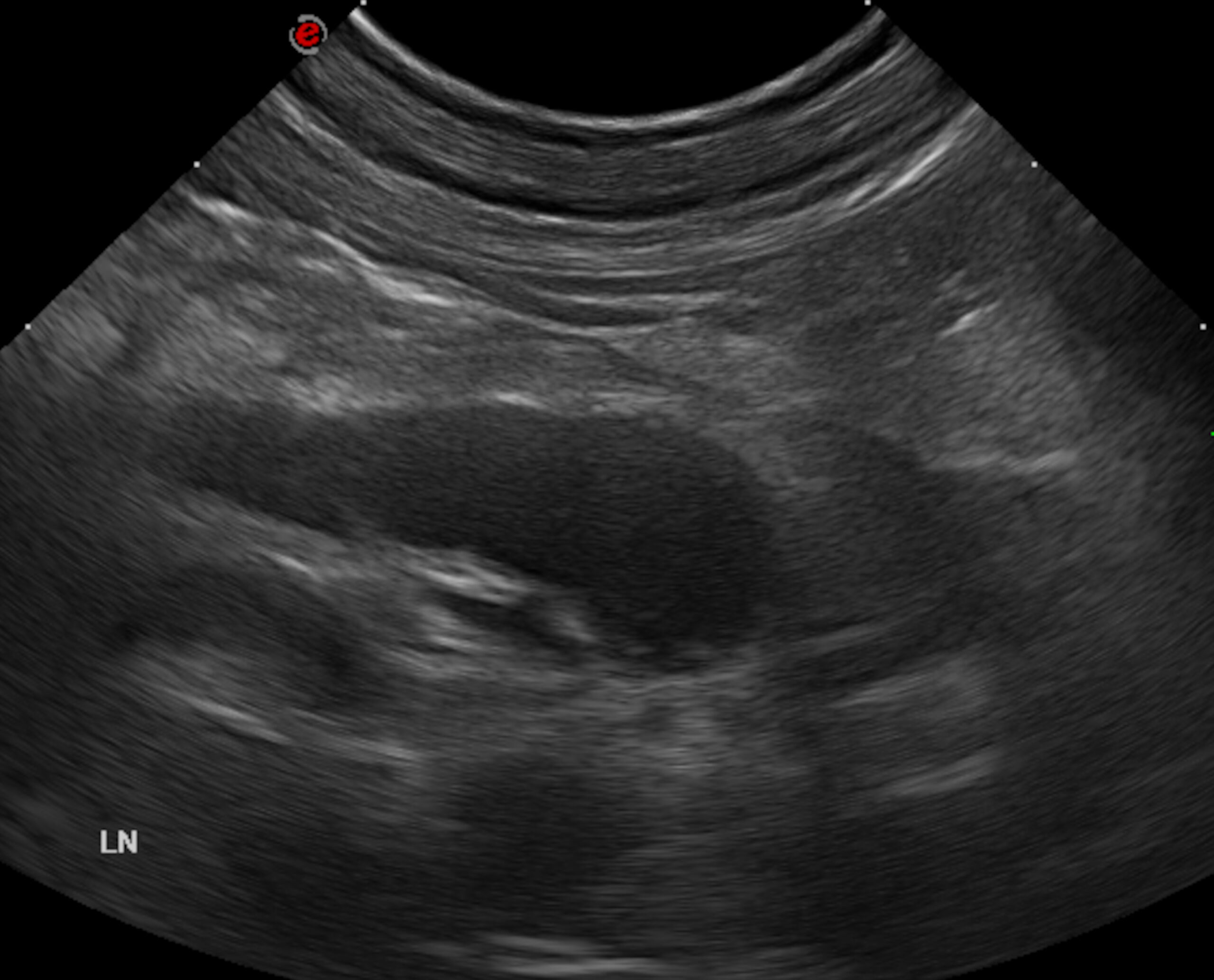 Analíticamente, destaca una anemia normocítica normocrómica no regenerativa con un hematocrito del 20 % (35 – 60 %), trombocitopenia de 43 000 plq/µL (140 000 – 520 000), leucocitosis de 22 860 leuc/µL (5 320 – 16 920), neutrofilia de 16 500 neut/µL (3 050 – 12 100) e hiperglobulinemia de 4,0 g/dL (1,6 – 3,7). En la ecografía abdominal se aprecia una marcada linfadenopatía abdominal generalizada con reacción peritoneal y esplenomegalia homogénea (Figura 1). Se realizan citologías de linfonodos mesentéricos (Figura 2).