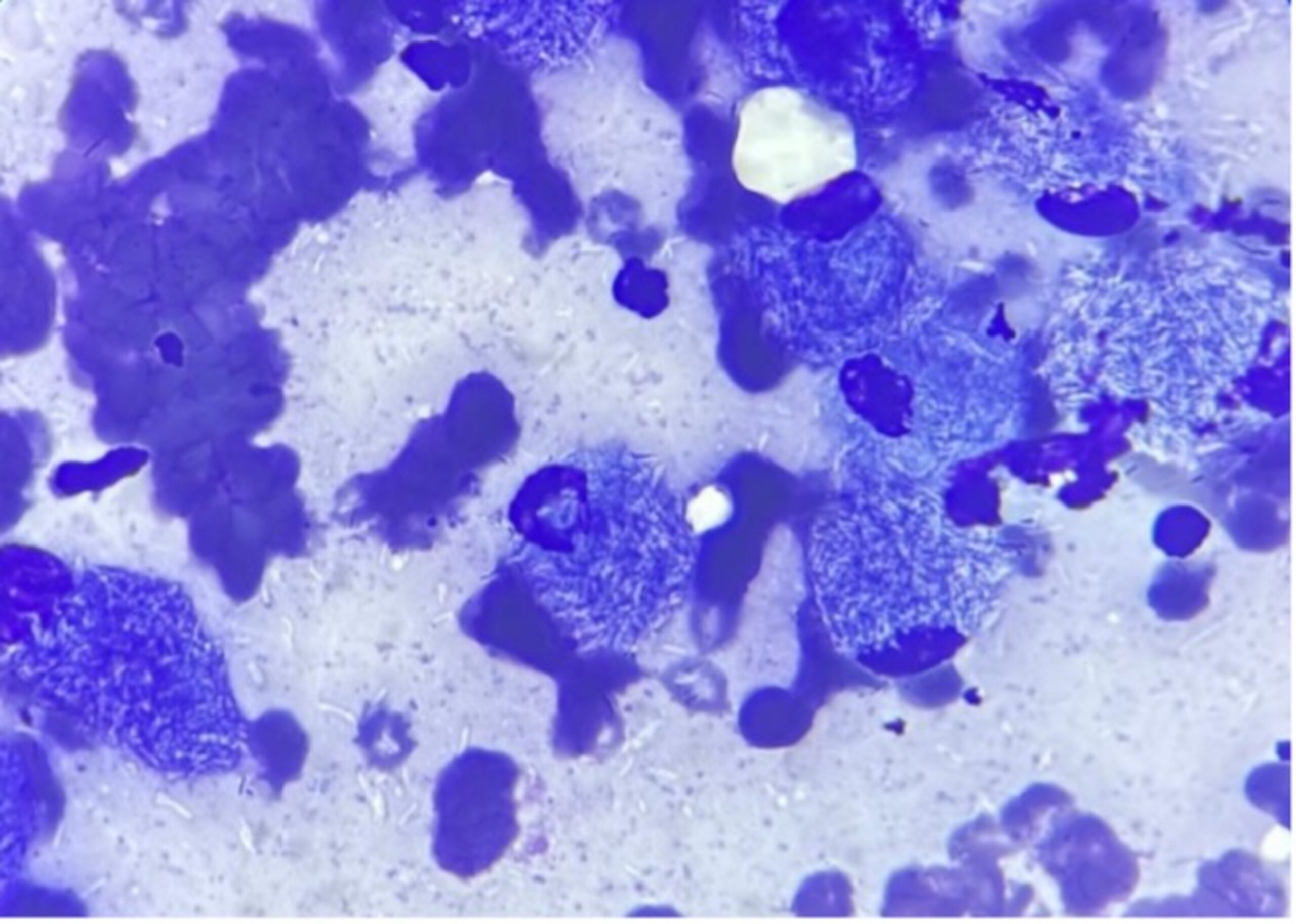 La evaluación citológica de un linfonodo mesentérico revela un proceso inflamatorio granulomatoso asociado a infección por micobacterias, la cual se confirmó mediante una tinción de Ziehl-Neelsen y PCR en tejido (Mycobacterium avium). La micobacteriosis sistémica en perros se trata con combinaciones de un mínimo de tres antibióticos; los más empleados son los macrólidos (claritromicina o azitromicina), las fluoroquinolonas y la rifampicina. La terapia suele extenderse por varios meses, con riesgo de recaídas y desarrollo de resistencia a los antimicrobianos. El pronóstico es grave a reservado, ya que la respuesta clínica suele ser pobre. En muchos casos se considera la eutanasia debido a la dificultad de control y la afectación multisistémica.
