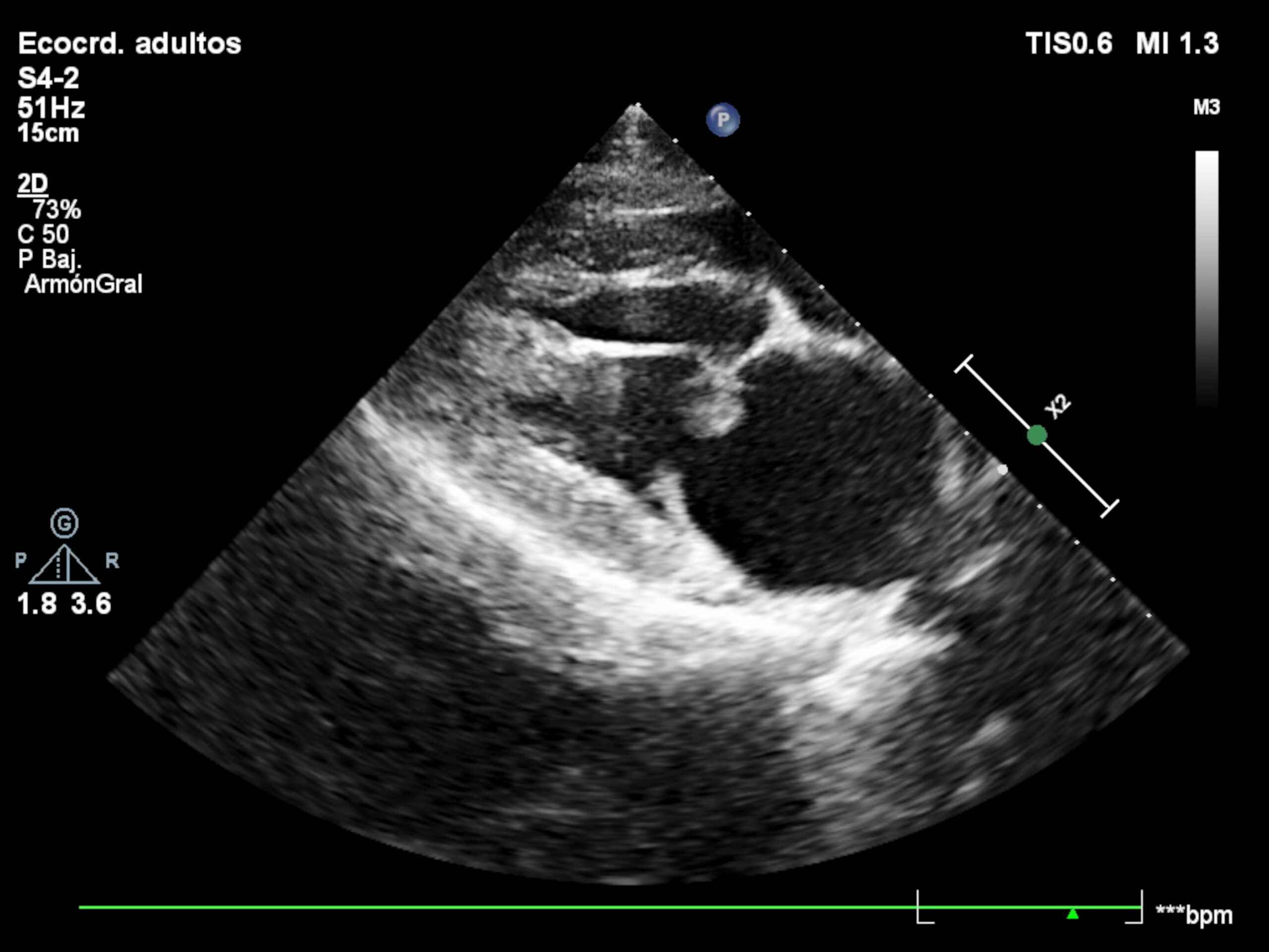 Mastín del Pirineo, macho castrado de 5 años, que acude por marcada debilidad generalizada, disuria y hematuria. En consulta se detectan mucosas congestivas, taquicardia de 180 latidos por minuto con ritmo irregular y fiebre de 40,3 °C. El electrocardiograma revela una arritmia ventricular multifocal. En el sedimento urinario se visualiza la presencia de piuria y bacteriuria con cocos intracelulares. Ante la sospecha de una urosepsis, se cursa un cultivo de orina y un hemocultivo (Tablas 1 y 2). Se realiza una ecocardiografía en la que se observa un engrosamiento marcado de la válvula mitral junto con la presencia de vegetaciones (Figura 3).