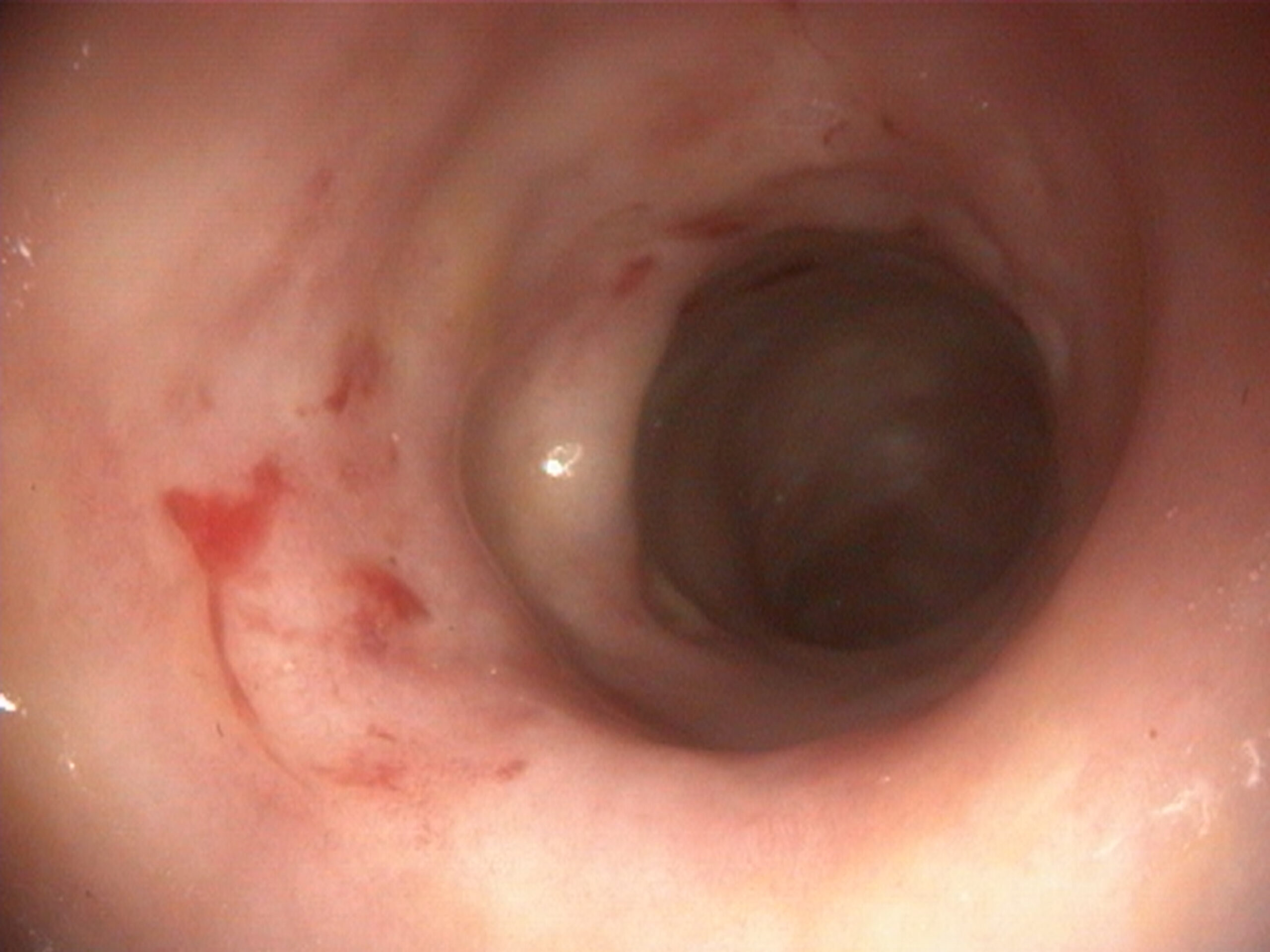Bulldog Francés, macho entero de 8 años, que acude por diarrea crónica de intestino grueso. Presenta heces mucosas con hematoquecia y tenesmo, sin pérdida de peso asociada, de seis meses de duración. En el examen físico general y en las analíticas completas no se detectan alteraciones destacables. Se realiza un coprológico con resultado negativo. La ecografía abdominal revela un engrosamiento marcado y difuso de la pared del colon, sin pérdida de estratificación. En la colonoscopia se aprecia la mucosa del colon marcadamente engrosada e irregular (Figura 4). El estudio histopatológico finalmente es compatible con una colitis granulomatosa.