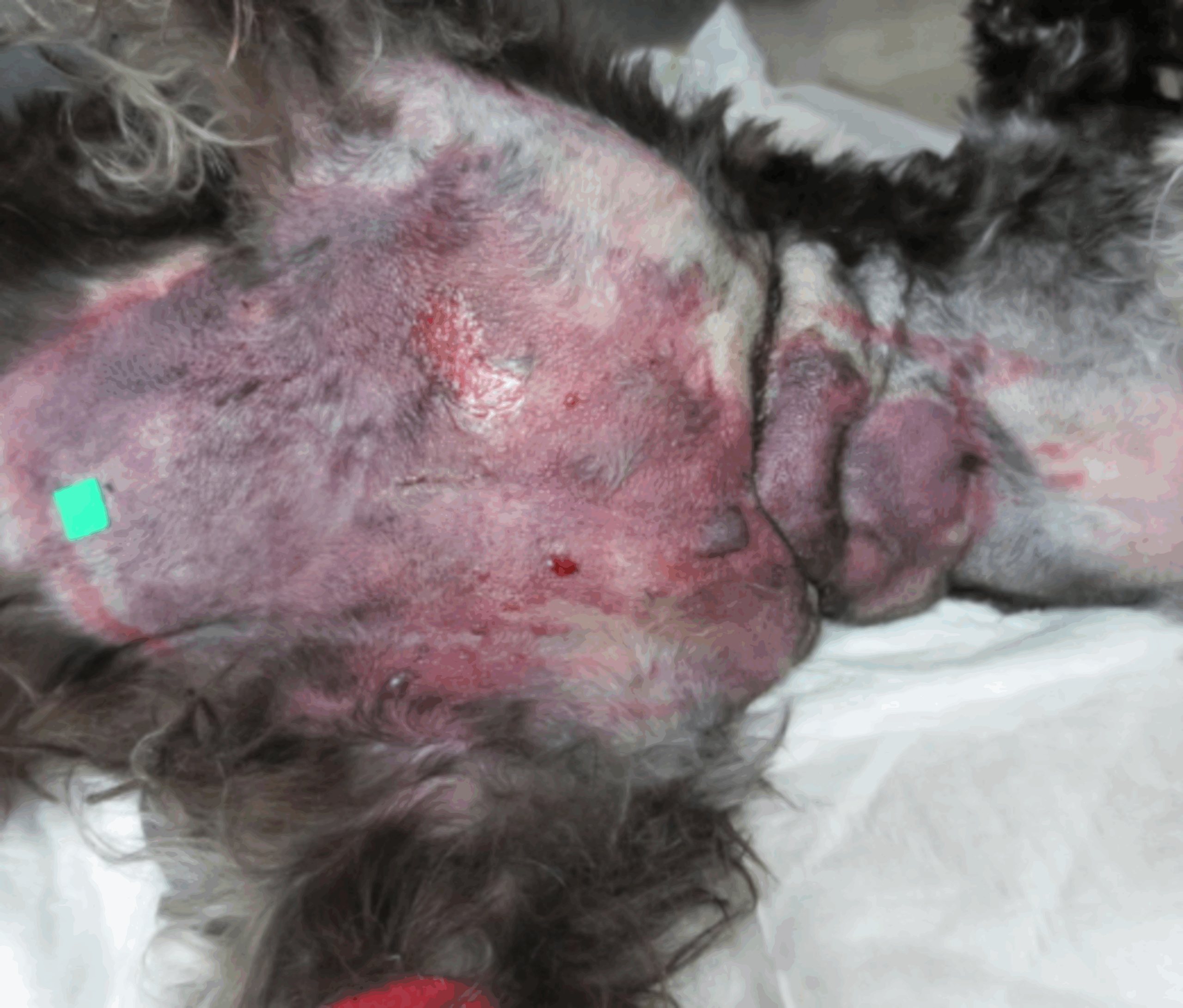 Schnauzer miniatura, macho entero de 7 años, que acude por inflamación aguda y dolor marcado en la zona cervical, pectoral y esternal de 24 horas de evolución. En la exploración física se observa tumefacción marcada, eritema, crepitación subcutánea, necrosis exudativa y presencia de vesículas serohemorrágicas (Figura 5). El tejido subcutáneo es muy doloroso y fluctuante al tacto. Presenta fiebre de 39,8 °C y taquicardia de 160 latidos por minuto. La ecografía del tejido muestra gas subcutáneo difuso y destrucción tisular compatibles con fascitis necrotizante. La citología del exudado evidencia inflamación neutrofílica con cocos intra y extracelulares (Figura 6).