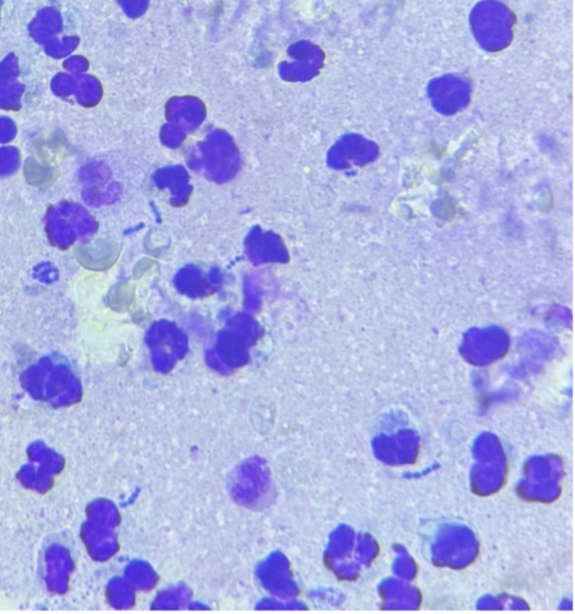 Figura 6. Impronta citológica de la lesión cutánea exudativa. Se observa un predominio de neutrófilos degenerados con presencia de cocos en racimo a nivel intra y extracelular.