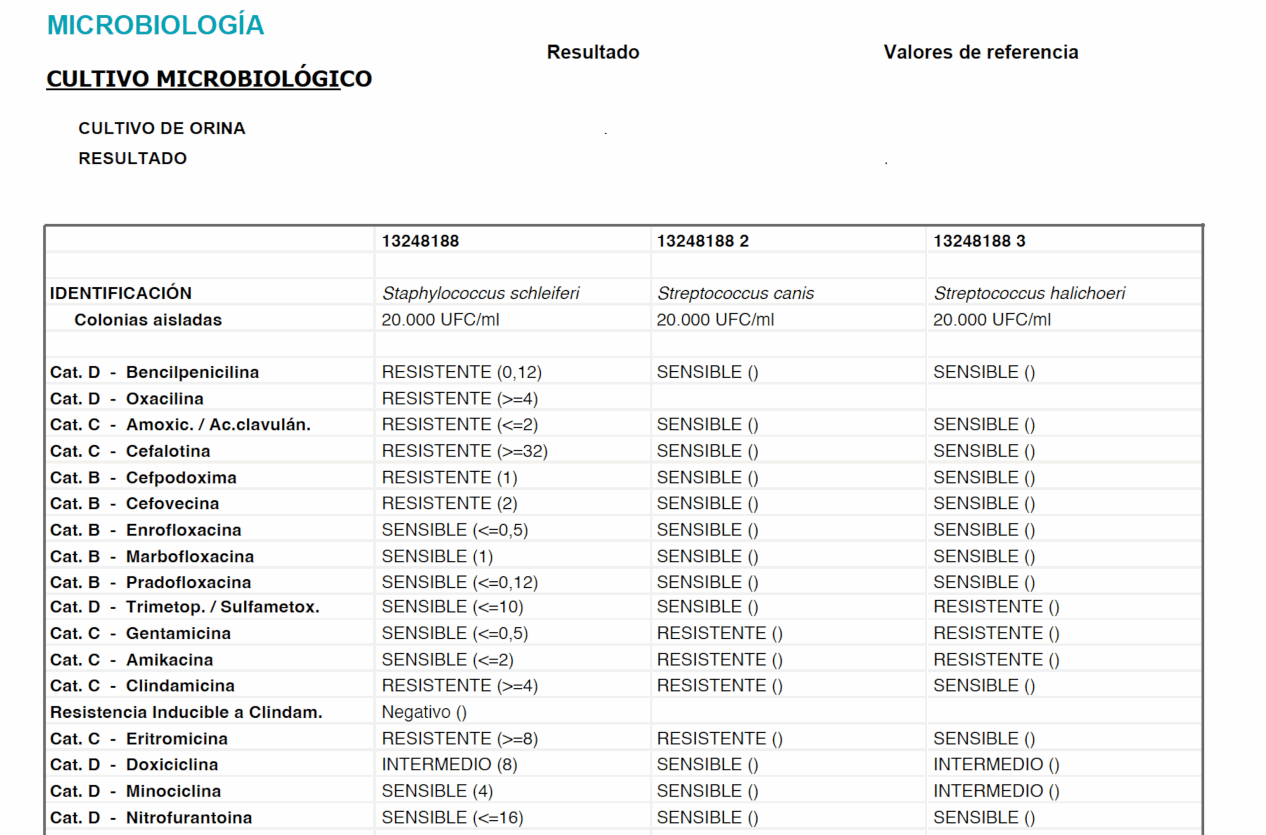 Tabla 1. Resultados del cultivo y antibiograma en orina.