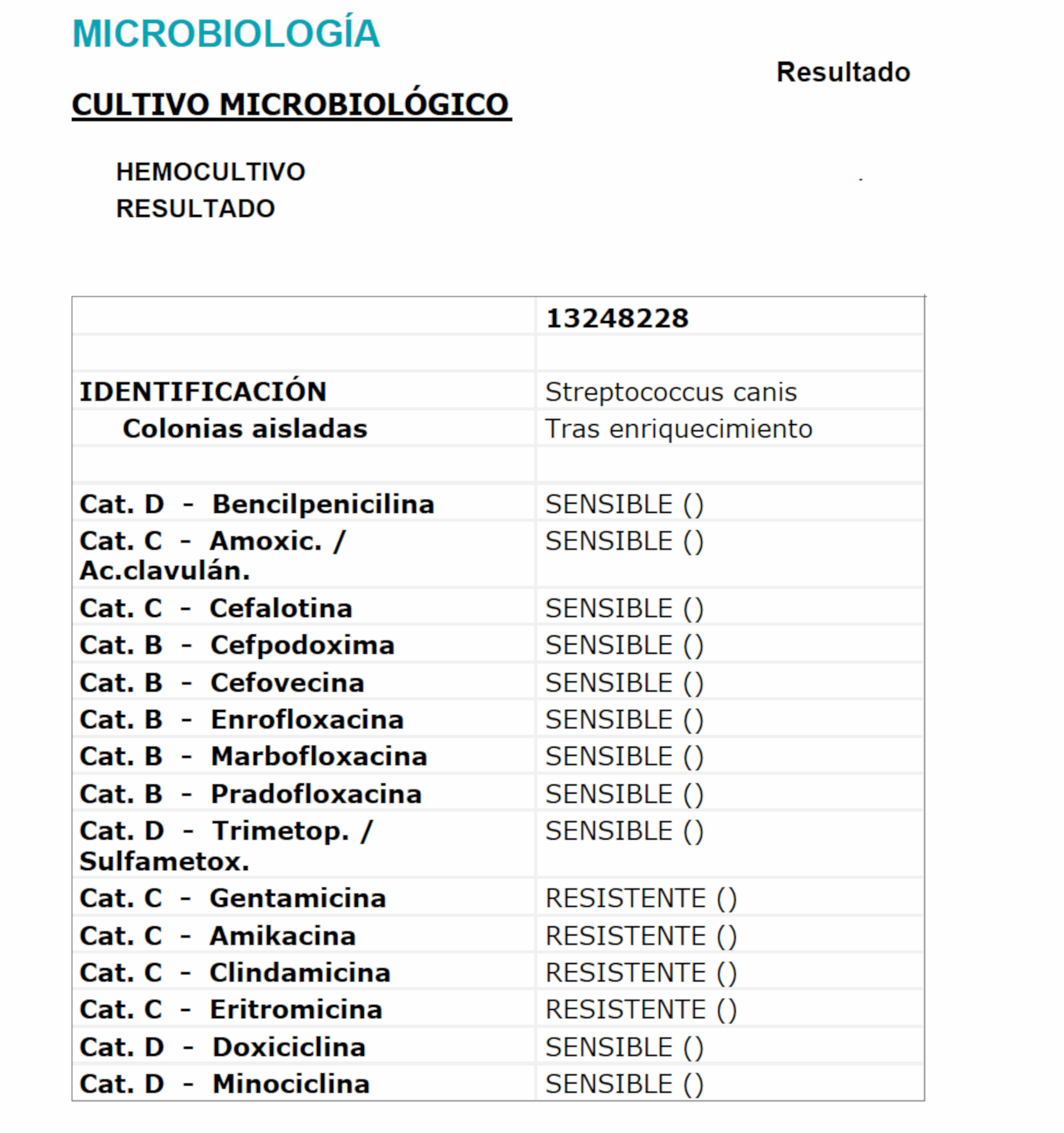 El diagnóstico más probable es una endocarditis de la válvula mitral secundaria a una infección urinaria bacteriana. Las especies bacterianas más comúnmente implicadas son los Staphylococcus spp. y Streptococcus spp., como en el caso expuesto. El tratamiento antibiótico recomendado suele ser la combinación de una ampicilina (p. ej. amoxicilina-clavulánico) junto con una fluoroquinolona (p. ej. enrofloxacina) o un aminoglucósido (p. ej. amikacina). La duración del tratamiento debe ser de al menos seis semanas. Se recomienda realizar un nuevo hemocultivo entre 1 y 2 semanas después del inicio y nuevamente entre 1 y 2 semanas tras finalizar la terapia antibiótica.