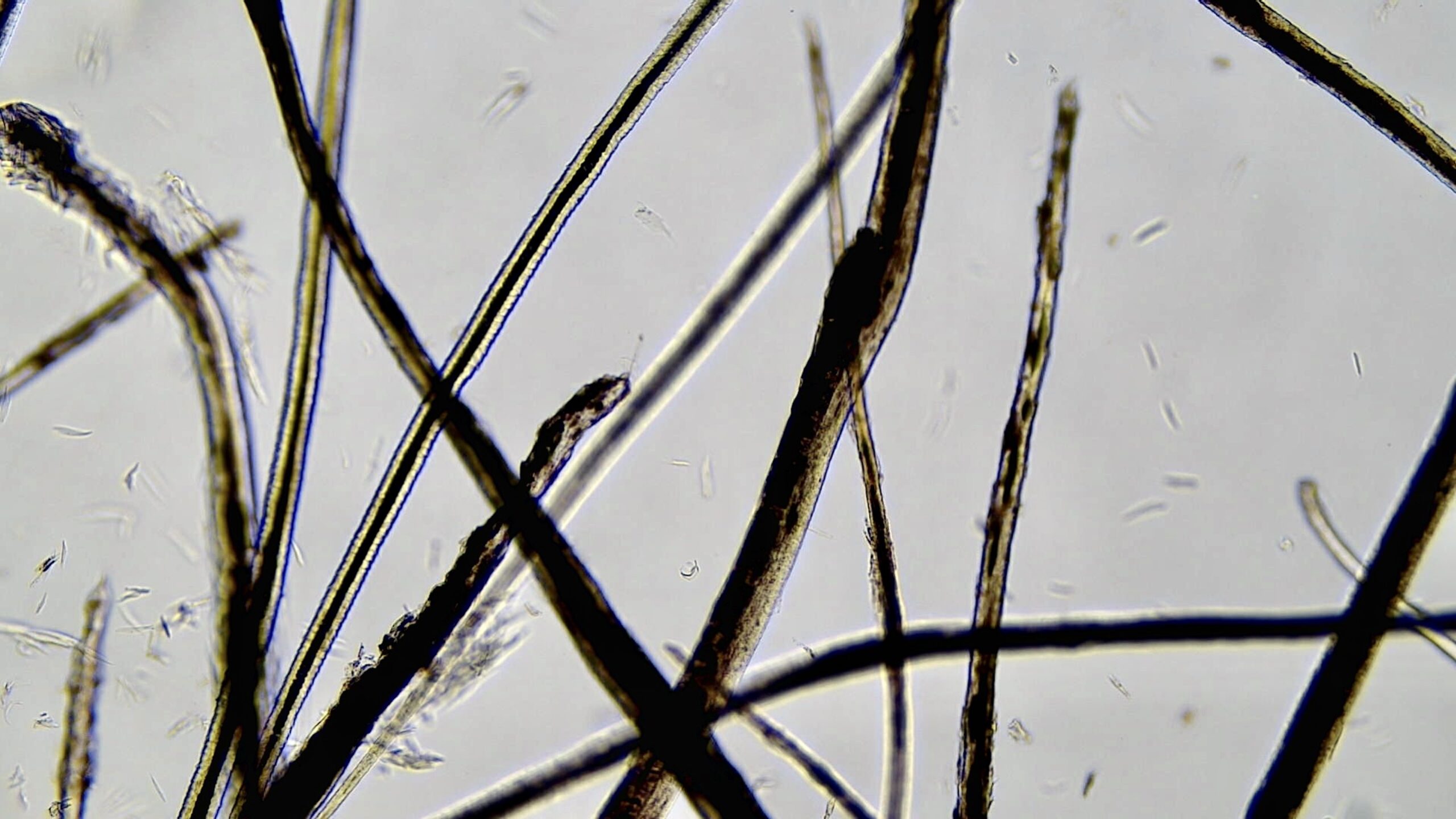 Perro Teckel, macho no castrado de capa azul de 1 año de edad. Se presenta en consulta por pérdida progresiva del pelo en la zona del dorso de 1 mes de evolución. En el examen dermatológico se identifica una hipotricosis en el dorso, flancos y en la cara externa de las extremidades. El paciente está correctamente desparasitado y los paseos los realiza por ciudad. El resto del examen físico y dermatológico es compatible con la normalidad. Teniendo en cuenta los hallazgos, se realiza un examen microscópico del pelo en la zona afectada (Figura 1).