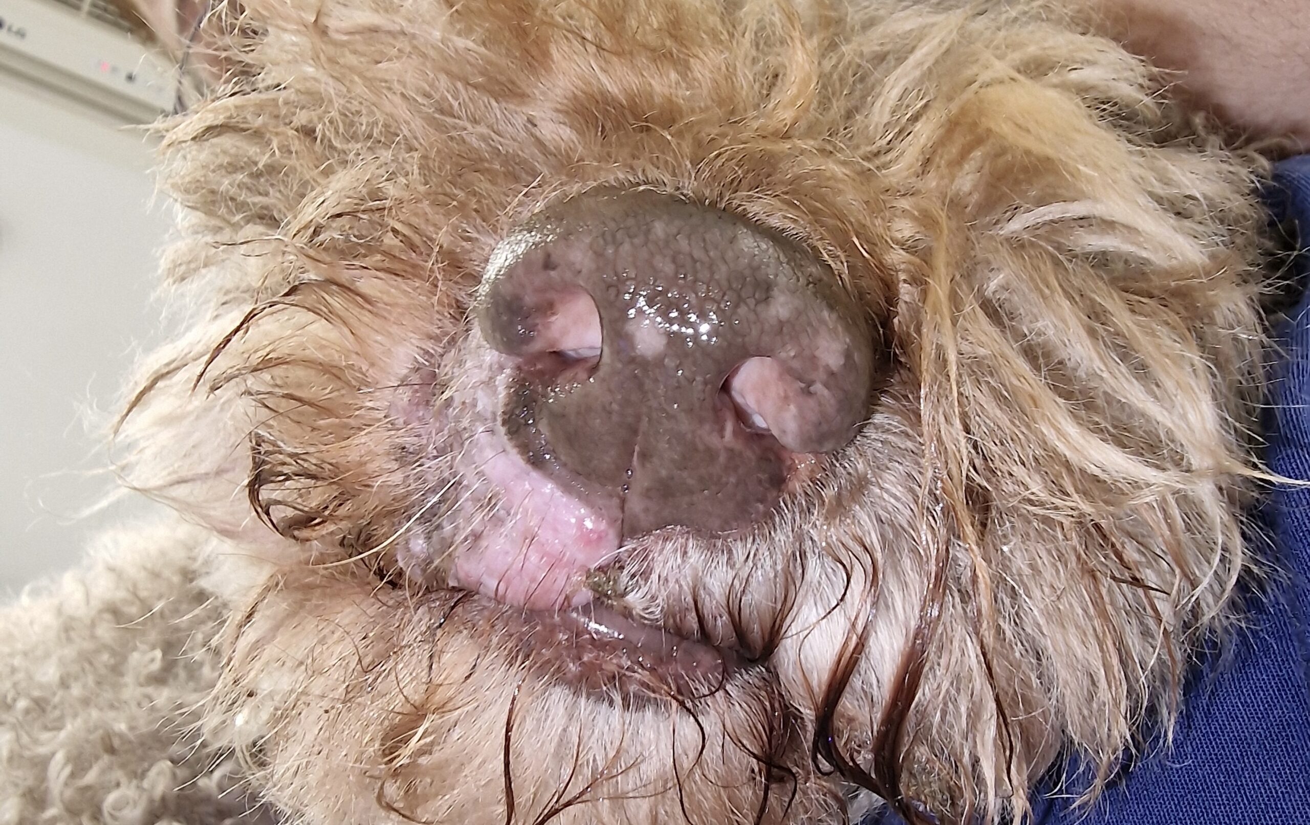 Perro de Agua Español de 13 años de edad. En tratamiento con salbutamol inhalado por bronquitis crónica. Desparasitaciones externas no actualizadas. Paseos por ciudad y sin contacto directo con otros animales. Se solicita una interconsulta por un área alopécica en el lado derecho del belfo de pocas semanas de evolución (Figura 2). Lesión no pruriginosa. Ausencia de lesiones dermatológicas en otras áreas.